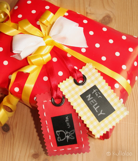 Alles, was man für die Erstellung der Geschenkanhänger benötigt, sind ein paar Stoffreste, Tafelfolie, Ösen und Bändchen. Dann kann man aus dem Stoff kleine Stücken zurechtschneiden, die Ösen festmachen und durch diese dann die Bändchen zum Anhängen ziehen. Da mein Stoff recht weich war, habe ich ihn einfach doppelt genommen und mit Vliesofix festgebügelt. Zum Schluss wird die Tafelfolie drauf geklebt und der nach Belieben beschriftet.
