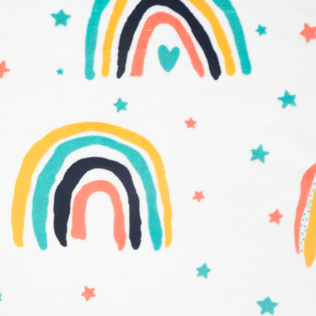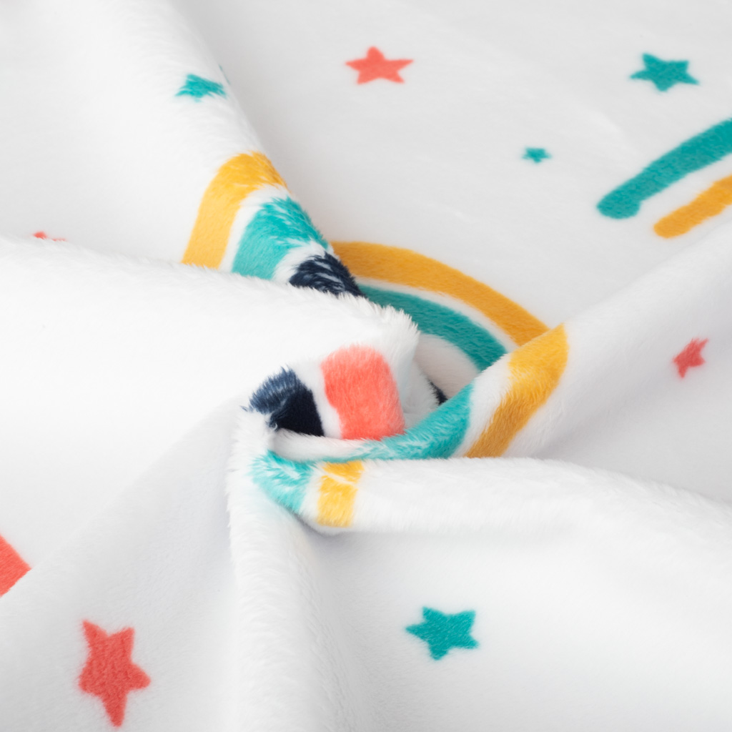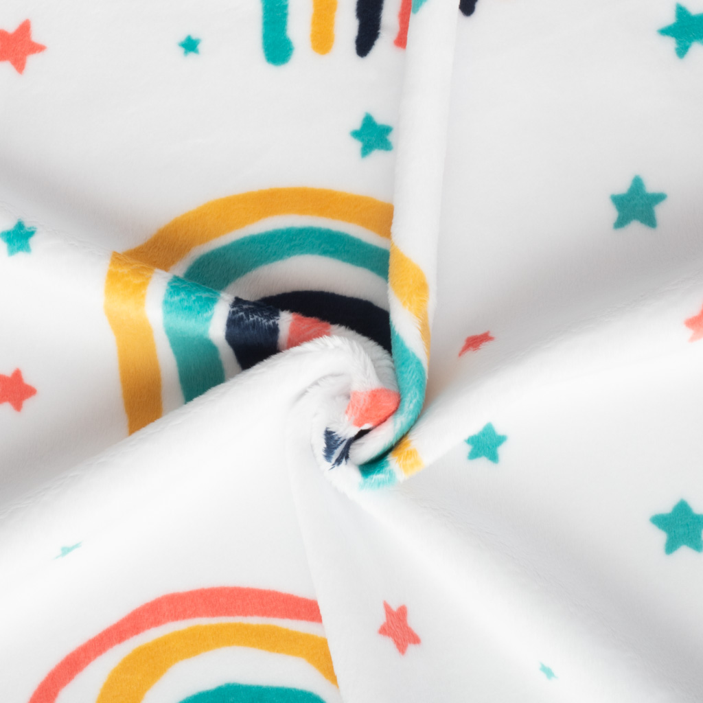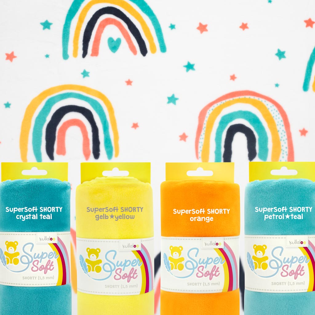 Der Plüsch mit den unterschiedlichen Regenbögen und Sternchen hat eine Florlänge von 3 mm und ist somit das perfekte Allroundtalent für die verschiedensten Nähprojekte. Der außergewöhnliche Plüsch besitzt eine sehr weiche Oberfläche, die zum Kuscheln und Wohlfühlen einlädt. Auf der Rückseite des Plüschs befindet sich Strick, sodass er sich gut verarbeiten lässt.