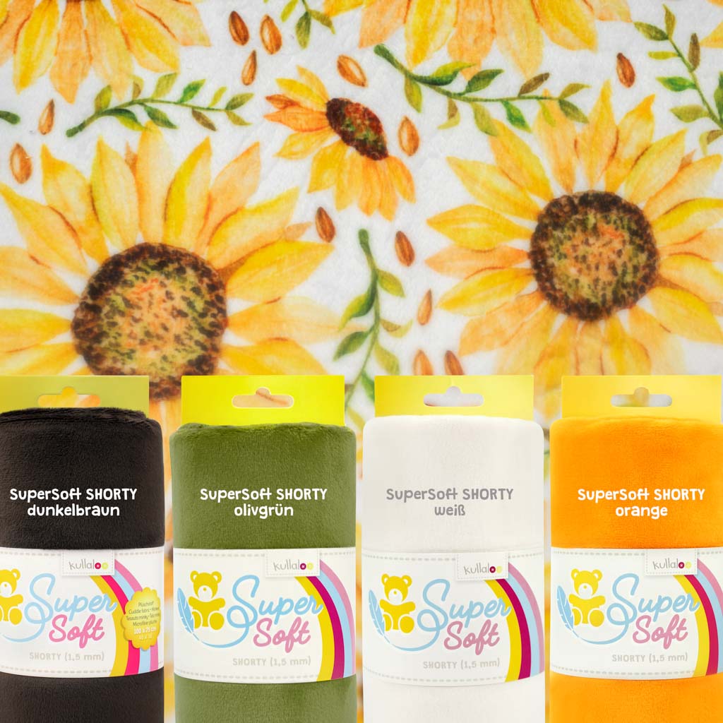 Der Plüsch Sunshine Flower Digital Cuddle® Sunshine lässt sich gut mit den kullaloo SuperSoft Plüschstoffen kombinieren! Besonders gut passen zum Beispiel SHORTY orange und SHORTY dunkelbraun.