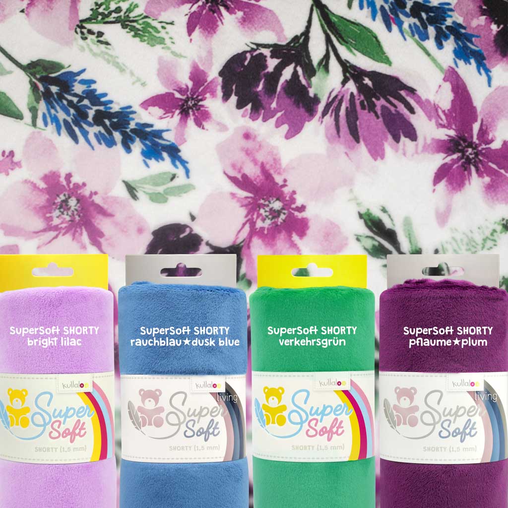 Der Plüsch Spring Flowers Digital Cuddle® Wisteria lässt sich gut mit den kullaloo SuperSoft Plüschstoffen kombinieren! Besonders gut passen zum Beispiel SHORTY bright lilac und SHORTY rauchblau.